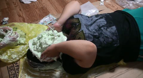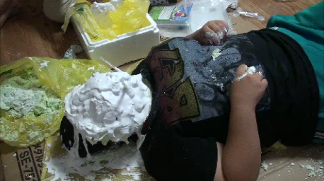 袋にある分量通りに型取り材を水で溶いて顔に盛っていきます。
