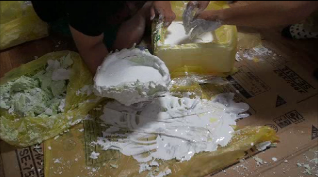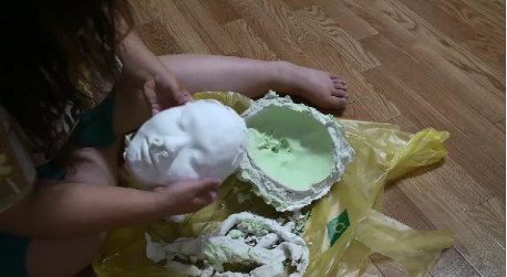 顔から外したら水で溶いた石膏を流しいれていきます。